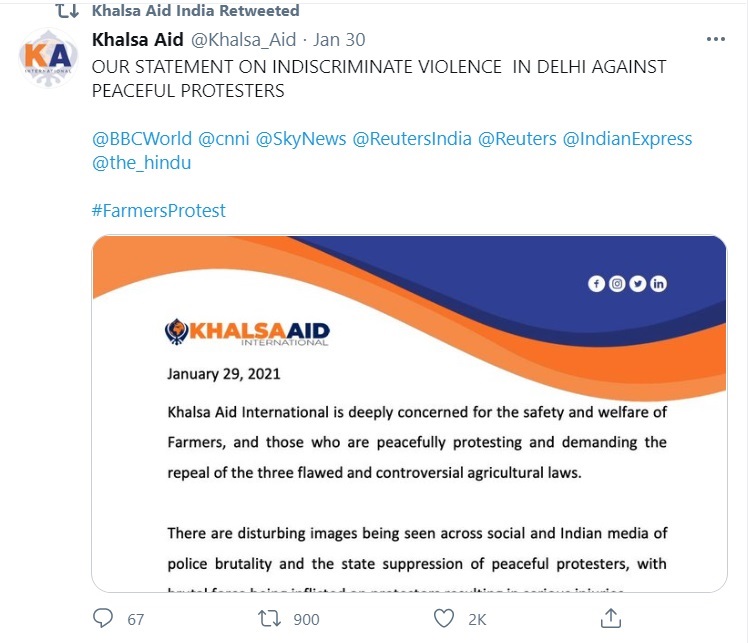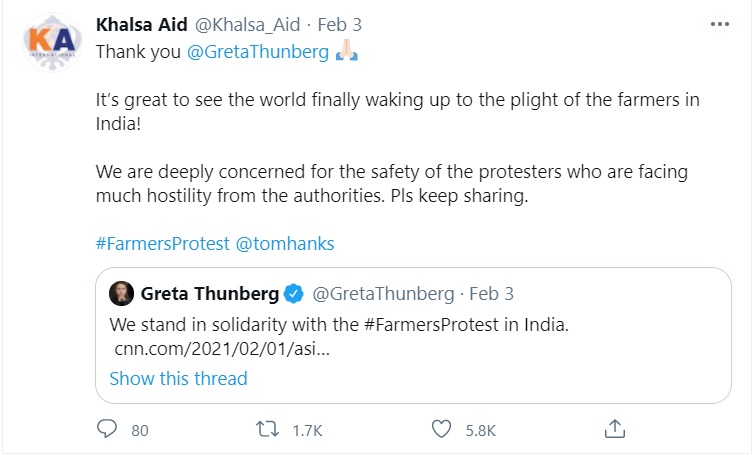 On Wednesday, Khalsa Aid was one of the first international organisations to follow instructions of tweeting Greta Thunberg’s tweet targeting Indian government over ‘farmer’ protests.