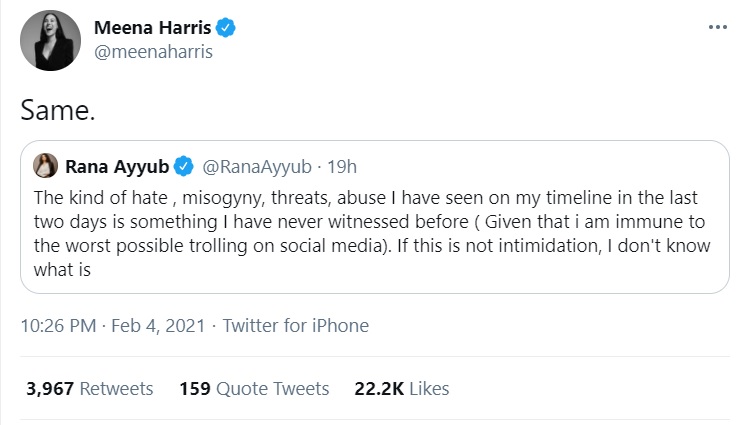 Meena Harris, who has a habit of flaunting her ties with United States Vice President Kamala Harris, has now gone to the extent using rabid Islamists and anti-India voices to meddle into Indian affairs. Sharing the tweets of Islamist troll and Hinduphobic propagandist Rana Ayub, Meena Harris attempted to not to only endorse the vandalism in the name of farmer protests but also tried to normalise Hindu hatred.
