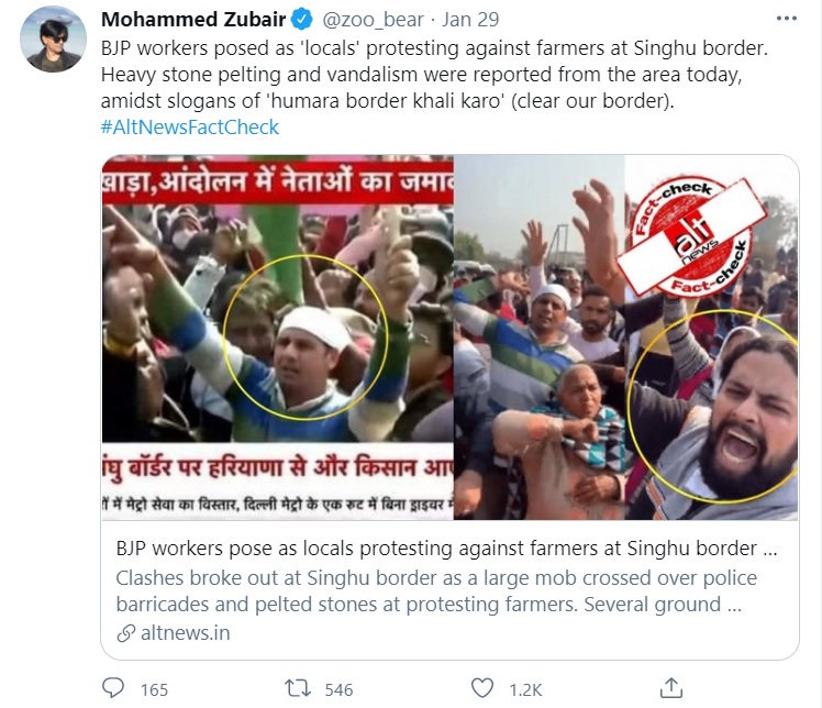 Here is a screenshot of a tweet put out by Zubair to pass of genuine locals residing near the Singhu border as ‘BJP’ supporters, who have suffered massive inconvenience due to the ongoing blockage of roads by the ‘protestors’.