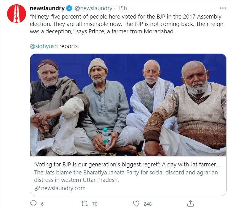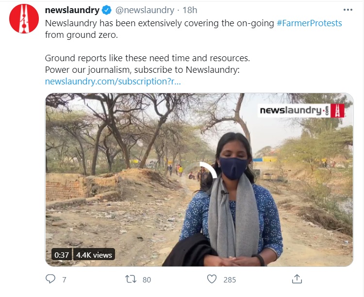 Most of News laundry ‘journalists’ have been tweeting and posting concocted stories about the farmer protests to depict them as a ‘legitimate’ protests against the government.