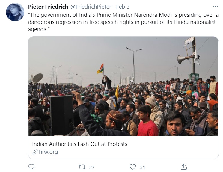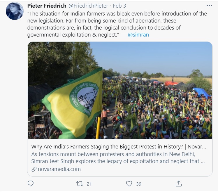 Here is another tweet put out by Pieter, which international propagandists may have used to spread false propaganda against the ‘farmer’ protests.