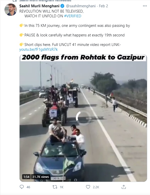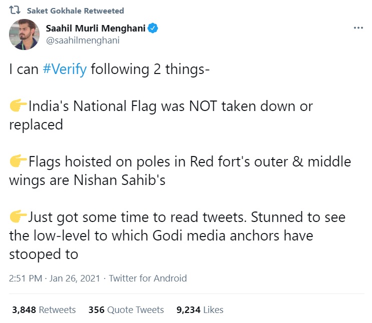 One of the social media accounts, which has been forefront at inciting the protestors and fomenting trouble is Saahil Murli Menghani. Saahil, who claims to be a journalist, has been posting tweets pertaining to the ‘farmer’ protests. In doing so, he has been publishing several unverified claims that are also alleged to have instigated riots on Republic Day in the national capital.