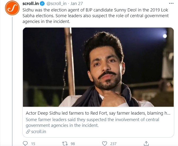 Scroll – a left-wing website which is currently under scrutiny for allegedly enabling foreign interference into country’s internal affairs, amusingly hold BJP responsible for the riots that occurred on Republic Day. Deep Sidhu, a known Khalistani sympathiser, has been termed as a BJP agent by the likes of Scroll in an effort to hide the international interference in support of the ‘farmer’ protests.