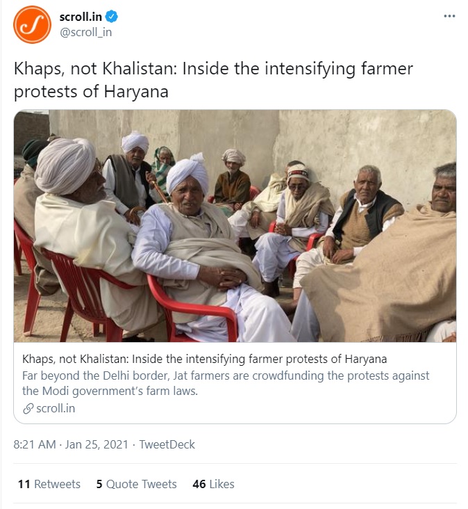 Yet again, Scroll has named Khaps – a community organisation representing a clan mainly comprised of Hindus in a few North India states, for ‘intensifying’ farmer protests.