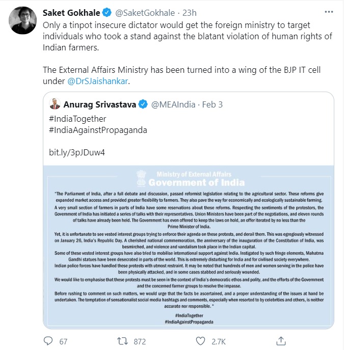 As similar to many left-wing social media users, Saket Gokhale too had objected to the Indian government’s statement against foreign interference into India’s domestic affairs.