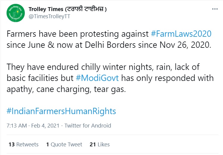 Trolley Times is a new entrant to the scheme of things. Trolley Times, which claims to be tweeting in support of ‘farmer’ protests from the very beginning, has been mentioned in the sensational ‘Greta Files’.