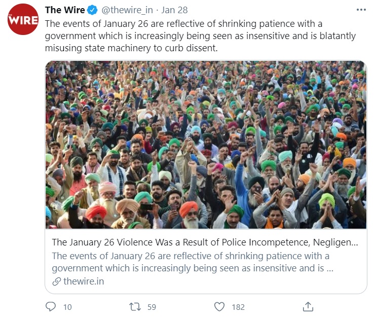 Similar to other left-wing propaganda websites, The Wire has also blamed the state machinery for the Republic Day violence.