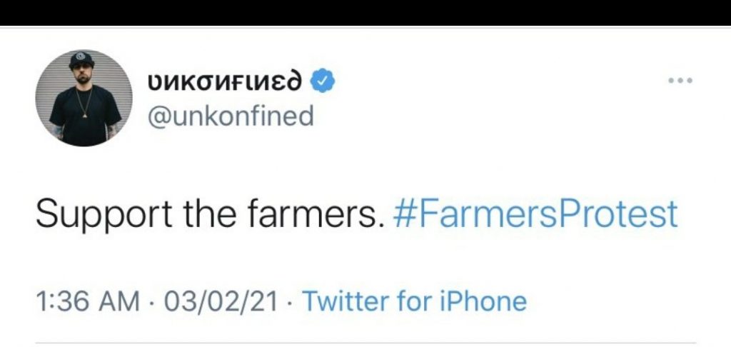 American Hip-Hop Artist Unkonfined (stylized ʋиκσиғιиɛ∂) who has a large following on the social media platform Twitter of around 3,83,400 followers, has deleted his tweet supporting the Farmers Protest. Unkonfined later posted a video explaining the reason why he had deleted his tweet. He said that he deleted the tweet because he does not know much about the matter.
