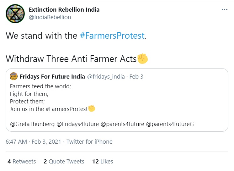 Finally, Extinction Rebellion – the global environmental movement allegedly linked to Greta Thunberg’s alleged activism, which has no locus-standi on Indian issue has been relentlessly trying to interfere in a local political protest.
