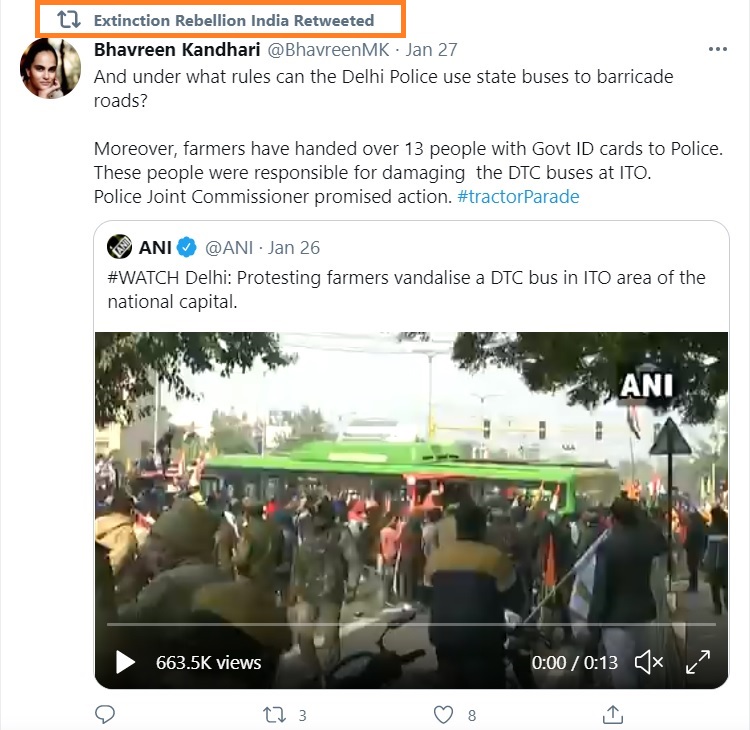 Here is a tweet retweeted Extinction Rebellion that condemns the Delhi Police’s action during the Republic Day riots. Why would a foreign NGO be worried about Delhi Police using buses to barricade roads a precaution against rioters?