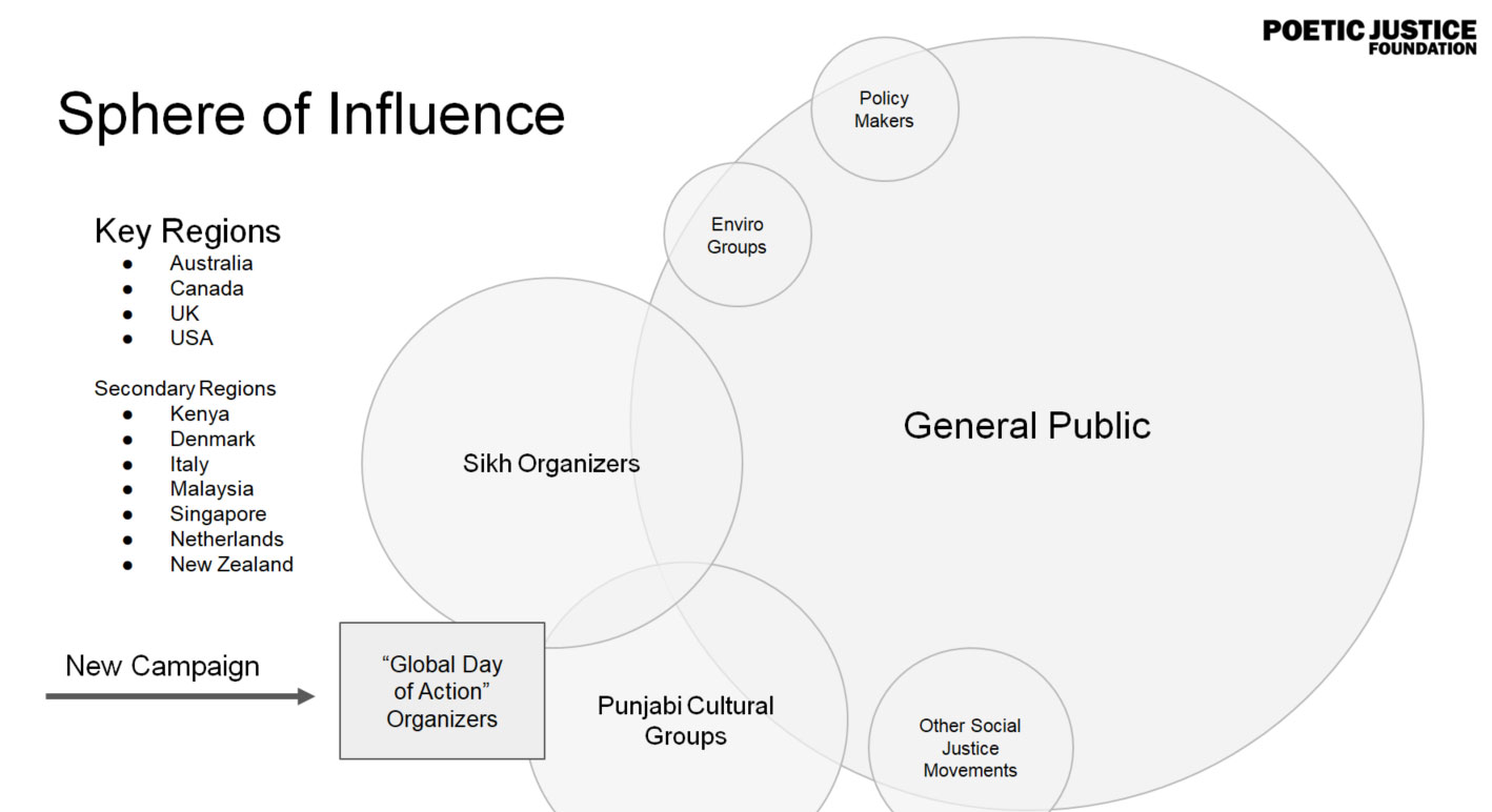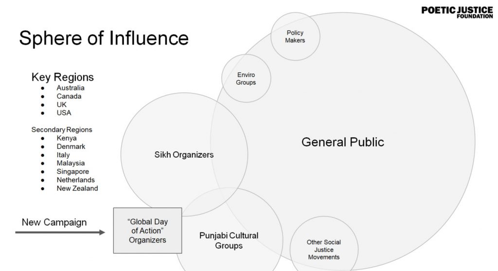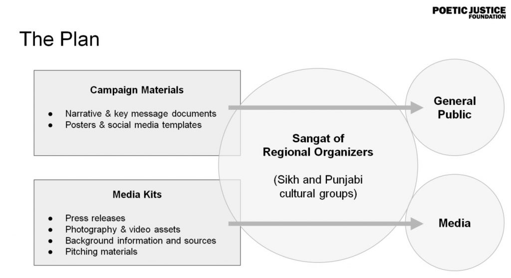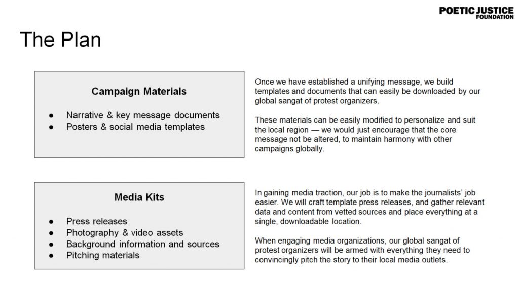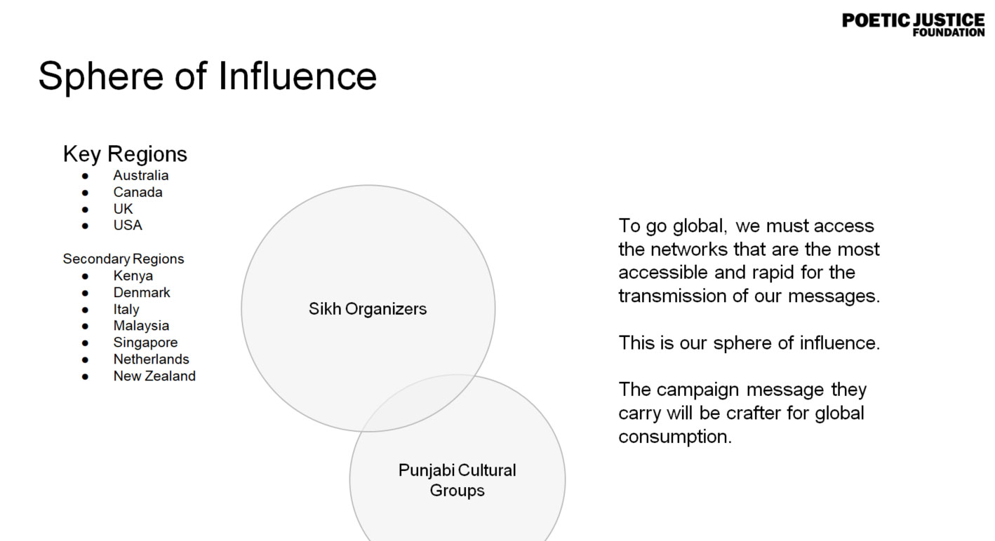 They said, “In gaining media traction, our job is to make the journalists’ job easier. We will craft template press releases, and gather relevant data and content from vetted sources and place everything at a single, downloadable location. When engaging media organizations, our global Sangat of protest organizers will be armed with everything, they need to convincingly pitch the story to their local media outlets.”