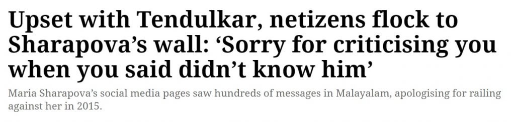 Several social media users from Kerala ‘regreted’ over their sharp criticism and ridicule in the past directed towards Russian tennis star Maria Sharapova, who had once claimed of not being aware of Sachin Tendulkar. During a press meet 7 years ago, Sharapova was asked about her opinion on Tendulkar’s presence at one of her matches, to which she had responded saying she did not know him.