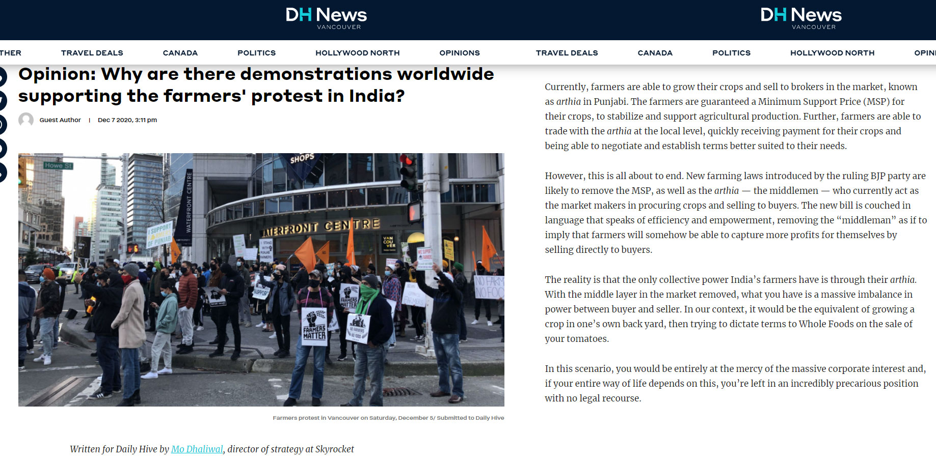 Propaganda article written by Mo Dhaliwal to spread misinformation (Image source: DailyHive.com)