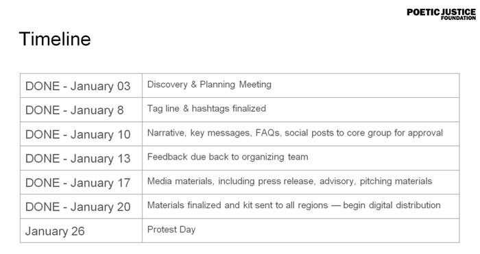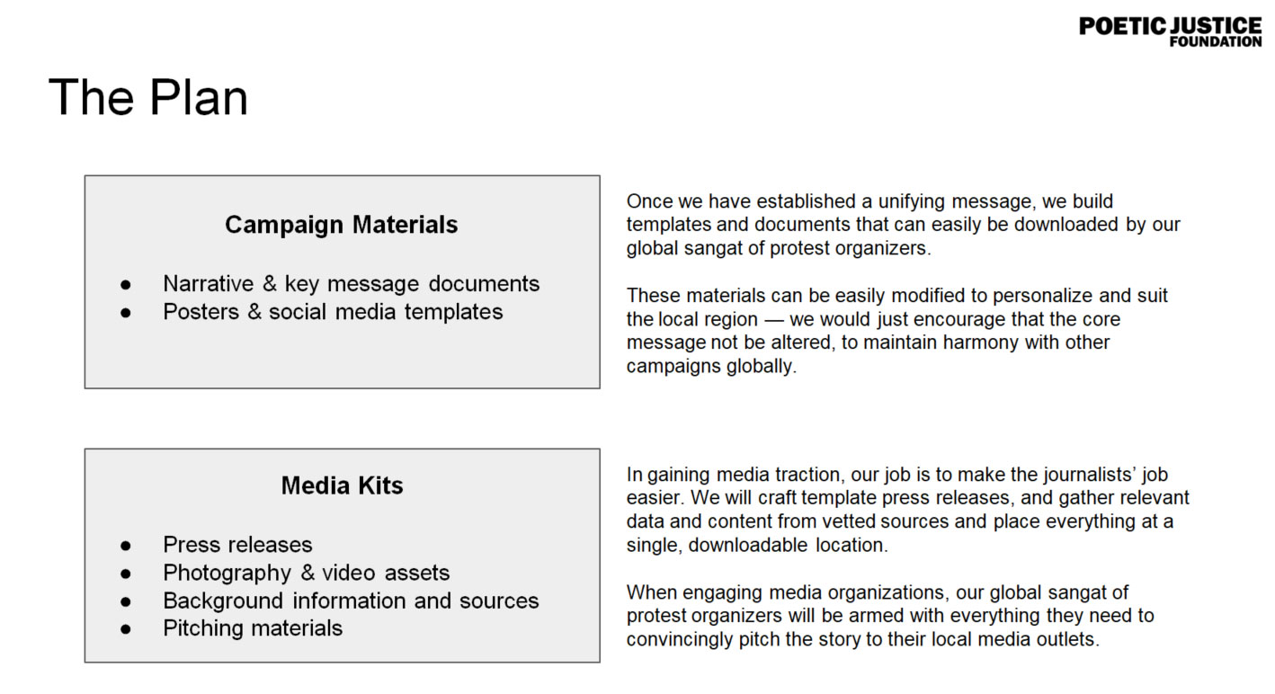 According to the document accessed of the Poetic Justice Foundation campaign, it had a dedicated plan that went back as far as January 3, 2021. The group provided taglines, hashtags, tweet formats, posters, media kits, printable artwork and much more for the people who wanted to support them in the campaign. By January 20, they had sent the material and kits to everyone who had shown interest using their Google Form for the same.