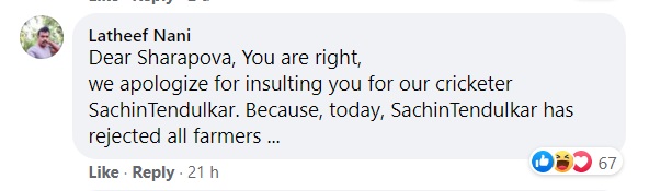 Latheef Nani, another Congress supporter, claimed that Sachin Tendulkar rejected all the farmers. In reality, there was not even a single tweet put out by Sachin against farmers or for that matter farm laws. However, the Congress party workers, the champions of liberal values, have targeted Sachin Tendulkar for just expressing his opinion.