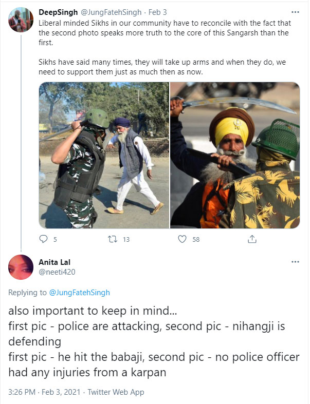 After 26 Jan violence, she replied to a post with Nihang Sikh attacking police personnel and justified the violence.