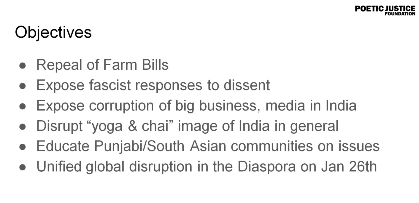 Co-founded by Mo Dhaliwal, a Canadian resident and Khalistan supporter, and Anita Lal, another resident of Canada and Khalistan supporter, Poetic Justice Foundation started a campaign under the ‘Global Day of Action’ format. According to the document accessed of the Poetic Justice Foundation campaign, it had a dedicated plan that went back as far as January 3, 2021. The organisation had prepared a step by step guide for the global campaign to malign India. One of the slides in the presentation was one that detailed their ultimate ‘objectives’.
