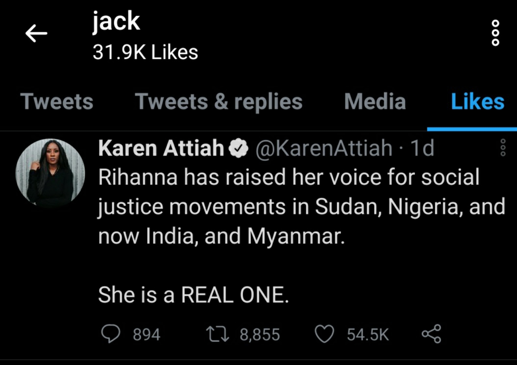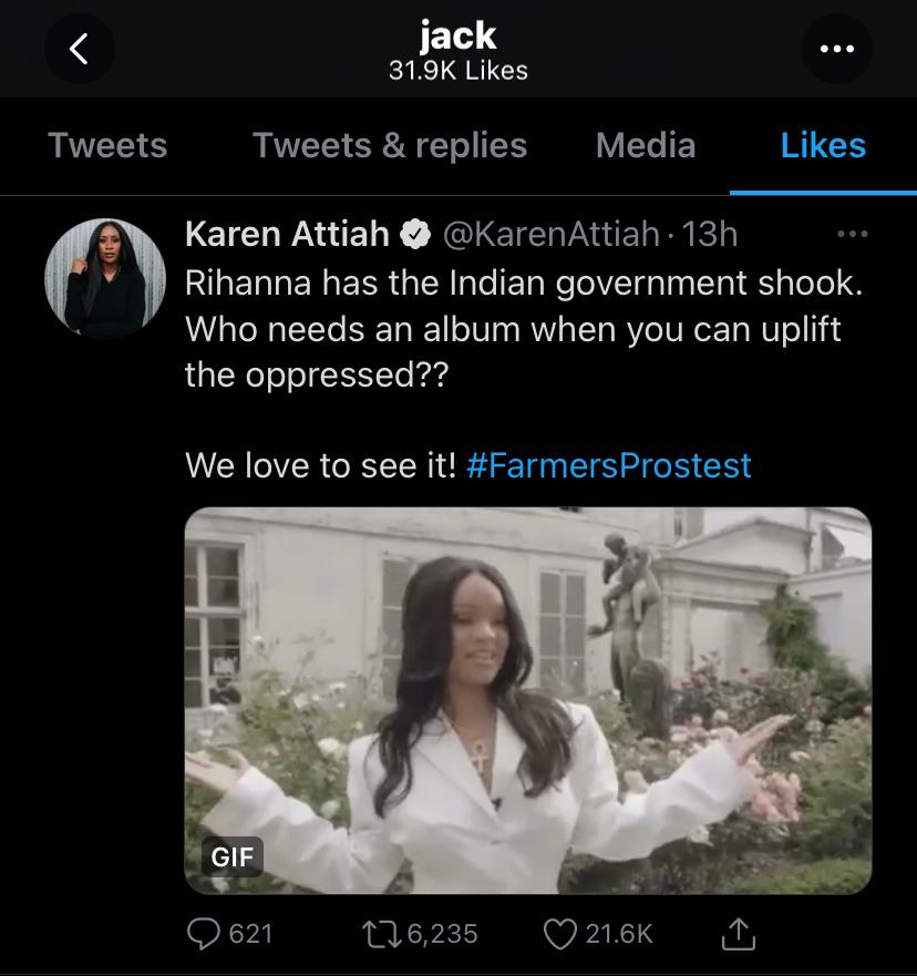 Jack, the CEO of Twitter, promptly responded to Karen Attiah’s fascination for Rihanna and her attempts to meddle in another country’s affair by ‘liking’ all her posts. Essentially, Jack Dorsey has now expressed his willingness to play a much larger role in influencing users against India, especially the Modi government.