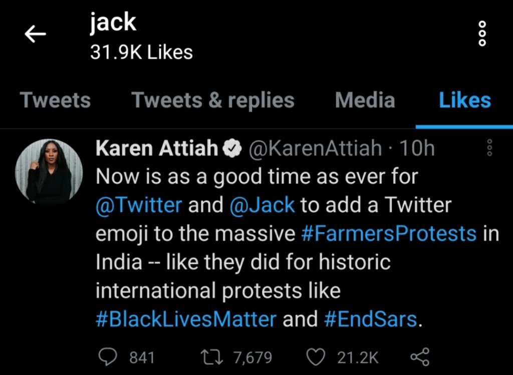 Continuing to fantasise about Rihanna, Karen Attiah, in another tweet, said that it was a good time for Twitter and Jack to add an emoji in support of the massive ‘farmer’ protests in India as they did during the ‘historic’ protests like ‘Black Lives Matter’ and ‘End Sars’. She tagged Twitter and Jack’s handles to demand an emoji supporting political protests that have nothing to do with her country.
