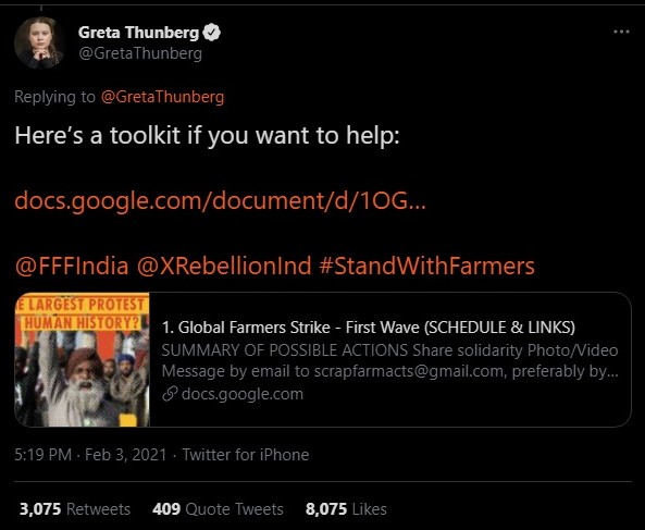 Climate environmentalist Greta Thunberg inadvertently revealed the sinister global campaign against India after she shared a ‘Toolkit’ for those who want to support the ongoing ‘farmer protests’ in the country.