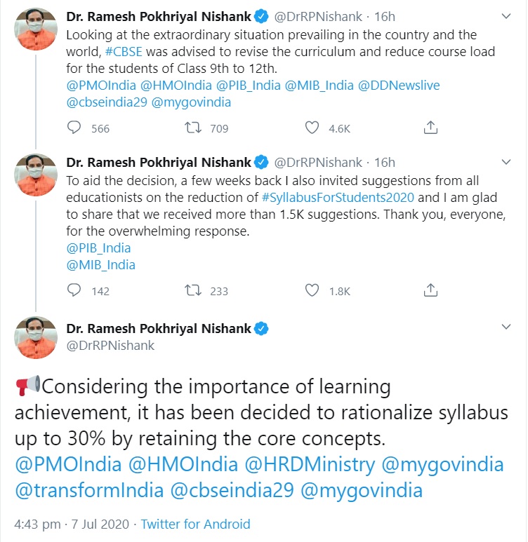 “Looking at the extraordinary situation prevailing in the country and the world, CBSE was advised to revise the curriculum and reduce course load for the students of Class 9th to 12th,” he added.