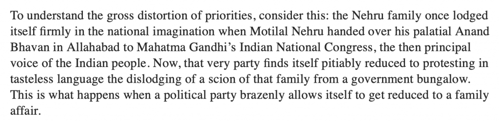 In this paragraph, the author says that Motilal Nehru gave his palatial bungalow to Mahatma Gandhi’s Congress and thus, firmly lodged itself in the national imagination. On the other hand, the current Congress uses tasteless language to defend itself after Priyanka being dislodged from her illegal government accommodation.