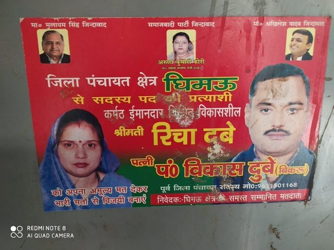 After the news of policemen losing their lives in an attempt to capture the gangster, several journalists tweeted the image of a poster that had the picture of the wife of Dubey along with the pictures of Akhilesh Yadav and Mulayam Singh Yadav.