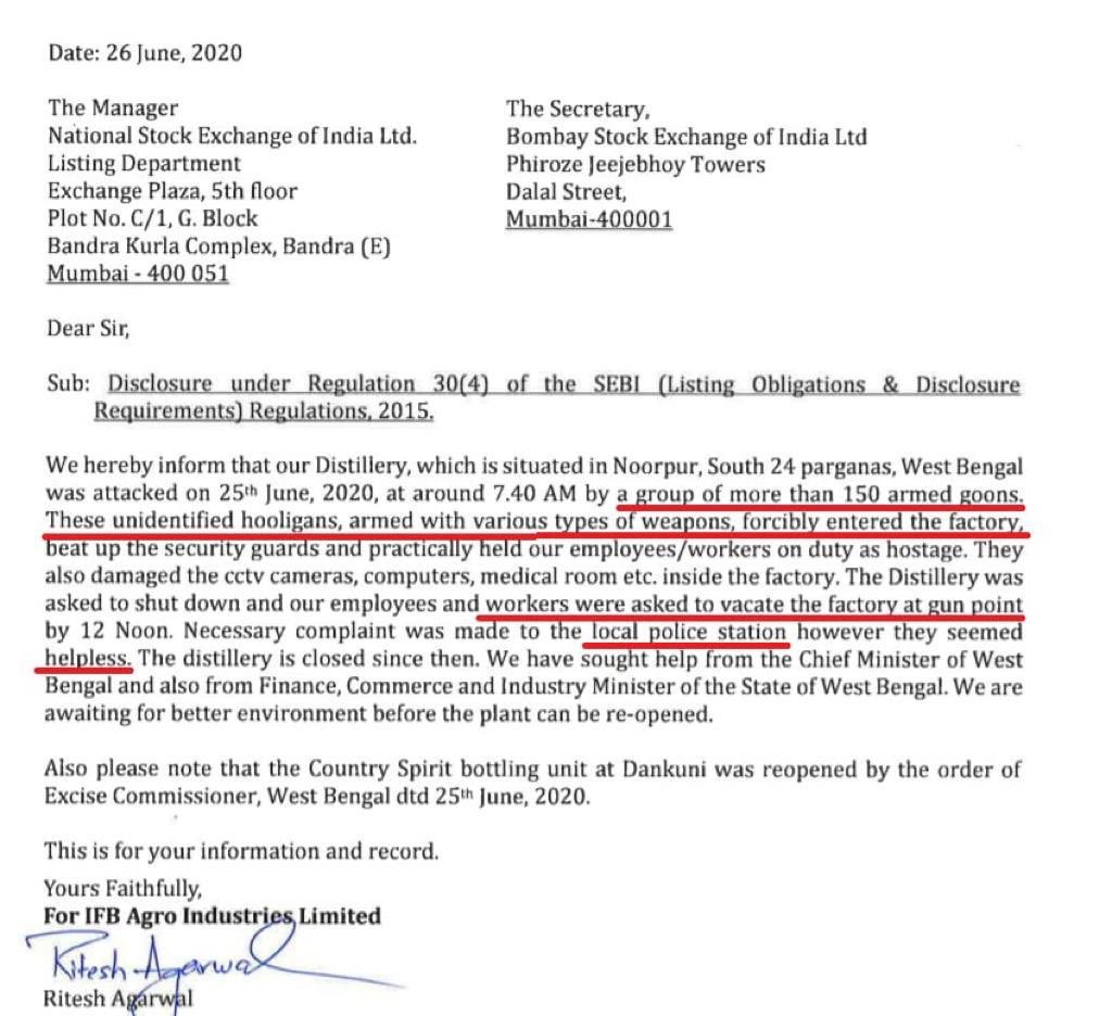 In the letter to National Stock Exchange, Ritesh Agarwal, DGM, IFB Agro Industries Limited, said that more than 150 armed goons entered the premises and beat up the security guards. They held the employees and workers hostage and damaged computers, medical rooms, CCTV cameras and other areas of the factory. The employees were asked to leave the premises on gunpoint before 12 PM. The factory was forced to shut down.