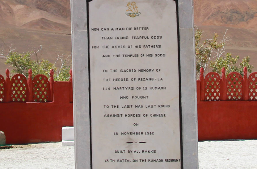 To the sacred memory of the Heroes of Rezang La, 114 Martyrs of 13 Kumaon who fought to the Last Man, Last Round, Against Hordes of Chinese on 18 November 1962.