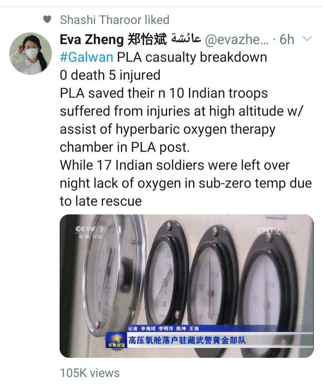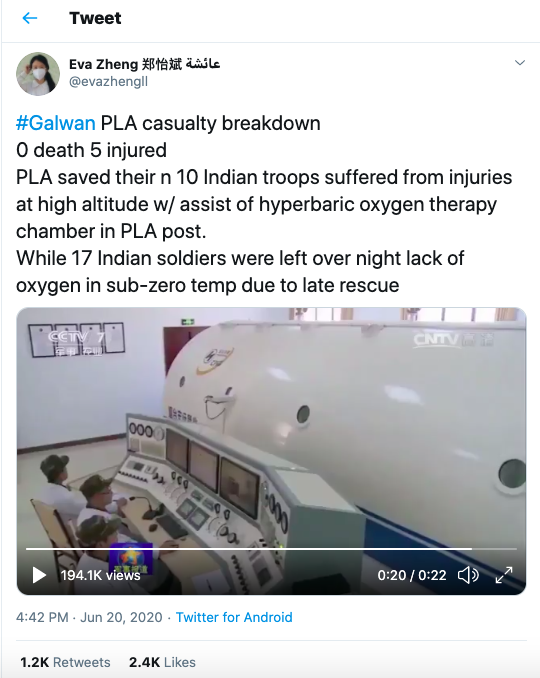 On Saturday, a Twitter account by the name of Eva Zheng claiming to be from China (where Twitter is officially blocked), tweeted a video with claims that in the Galwan Valley standoff between Indian troops and the Chinese PLA, the casualty breakdown of PLA stood at 0 deaths and 5 injured.