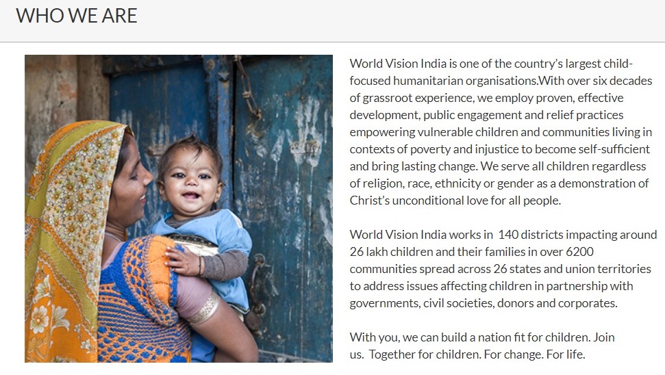 World Vision India makes a deliberate effort to portray itself as just another ‘humanitarian’ organisation even though it definitely is not. The differences in the description of the vision between World Vision and World Vision India makes it abundantly clear that there has been a conscious effort to hide their missionary roots.