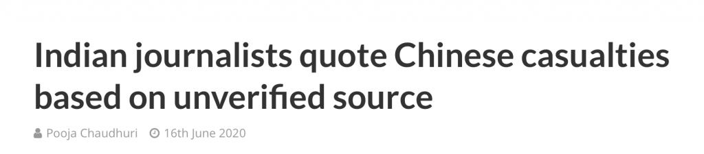 In this article, essentially, AltNews tried to “fact-check” the “rumour” about 5 Chinese soldiers being killed during the standoff with India. The Chief Reporter with Chinese state propaganda channel Global Times had tweeted that 5 Chinese soldiers were killed and 11 were injured during the standoff. This news was then picked up by several Indian journalists and Media houses.