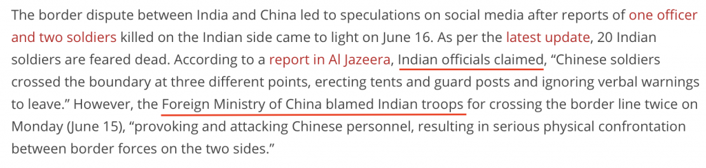 For AltNews, while Indian officials have “claimed” that it was China that crossed the LAC, China has “blamed” Indian troops. While in isolation, there is nothing wrong with the words used, together, it would seem that AltNews is trying to cast aspersions on India’s position and paint the Chinese position as the gospel truth.