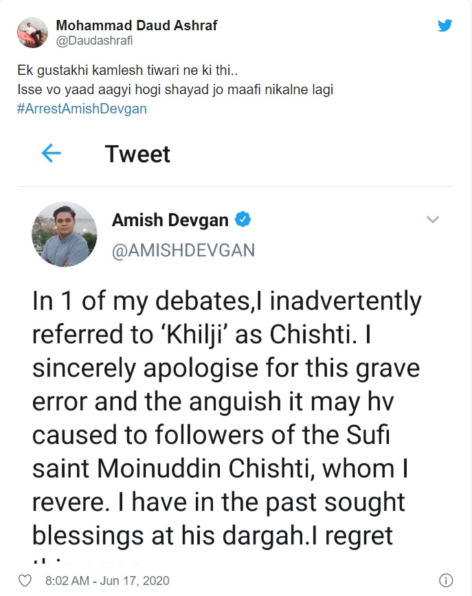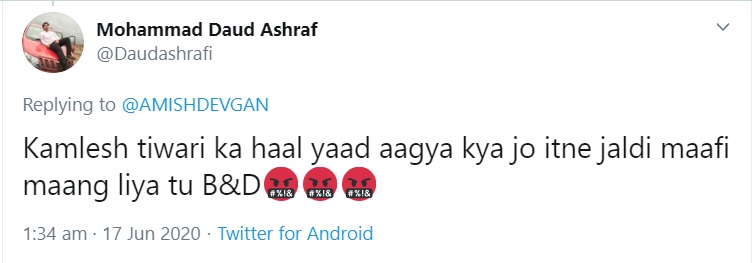 A user named Mohammad Daud Ashraf said that Devgan had indulged in a similar incident as Kamlesh Tiwari, however, the journalist apologised after being aware of the death of Tiwari.