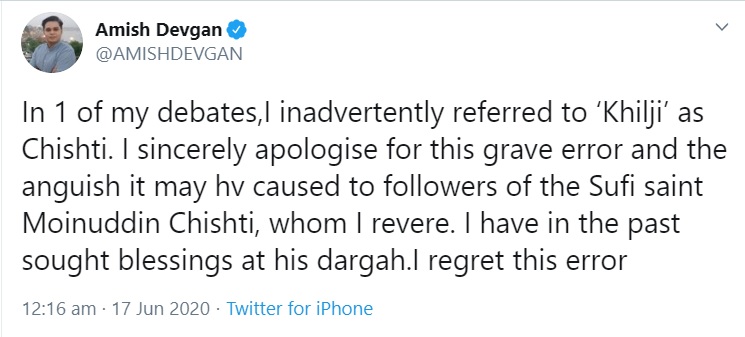 Devgan stated that he had pronounced ‘Chishti’ in place of Khilji and it was an inadvertent error.