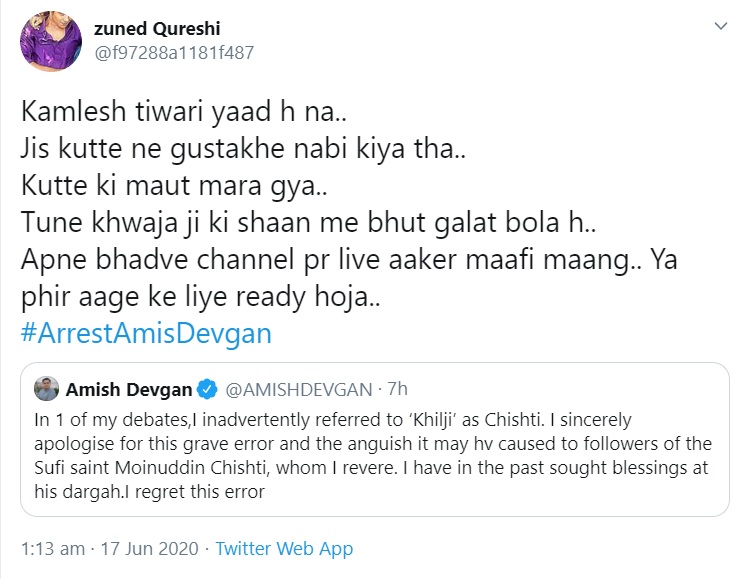Islamists on Twitter asked Amish Devgan to apologise for his remarks or be ready to be killed like Kamlesh Tiwari. One user named Zuned Qureshi was seen stating that Kamlesh Tiwari was ‘killed like a dog’ because he had insulted Prophet Mohammad. “If you do not apologise on your TV show you better be prepared for a similar end,” he wrote.
