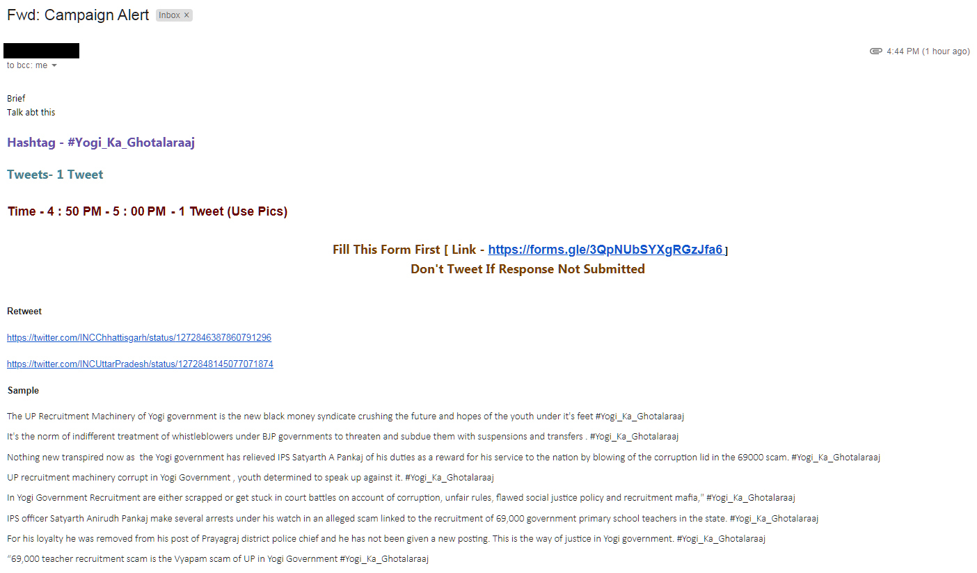 According to the email, specific instructions were issued by the Congress’ propaganda machinery to the IT cell warriors and party functionaries to tweet with the hashtag #Yogi_Ka_Ghotalaraaj along with the directive of using images attached in the email in the given time-slot. A list of sample statements targeting Yogi government on corruption was also provided to the online army of trolls which could be used by them in the tweets against the UP government. The members of the IT cell were issued particular instructions to retweet the tweets put out by the UP Congress and the INC Chhattisgarh Twitter account.