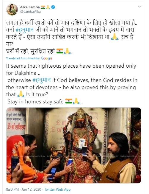 “It seems that religious places have been opened only for receiving Dakshina (donations). If Lord Hanuman is to be believed, God resides in one’s heart which he had proved it. Stay in homes stay safe,” the English translation of Alka Lamba’s tweet read.