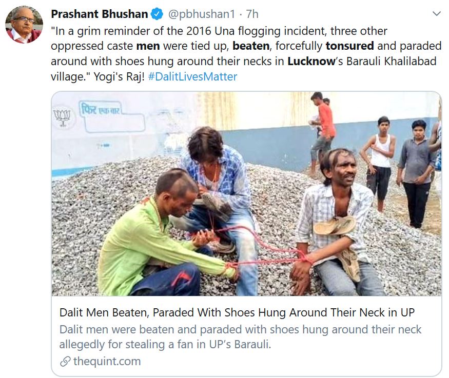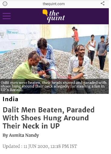 The Quint, had, in its article dated June 11, titled: “Dalit Men Beaten, Paraded With Shoes Hung Around Their Neck in UP” quoted PGI police station in-charge KK Mishra as confirming that in the incident that happened on 4 June, three men – one belonging to the OBC and the other two belonging to Scheduled Castes were tied up, beaten, forcefully tonsured and paraded around with shoes hung around their necks in Lucknow’s Barauli Khalilabad village after they were allegedly caught stealing a fan from a house of a ‘Brahmin man’.