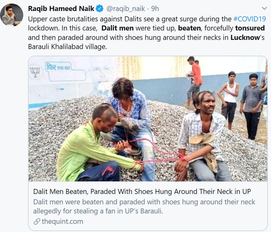 Kashmiri journalist Raqib Hameed Naik, who also writes for portals like The Wire and The Caravan too piped in, also claiming that there has been a ‘sudden surge’ in upper-caste brutalities against Dalits during the Covid-19 lockdown.