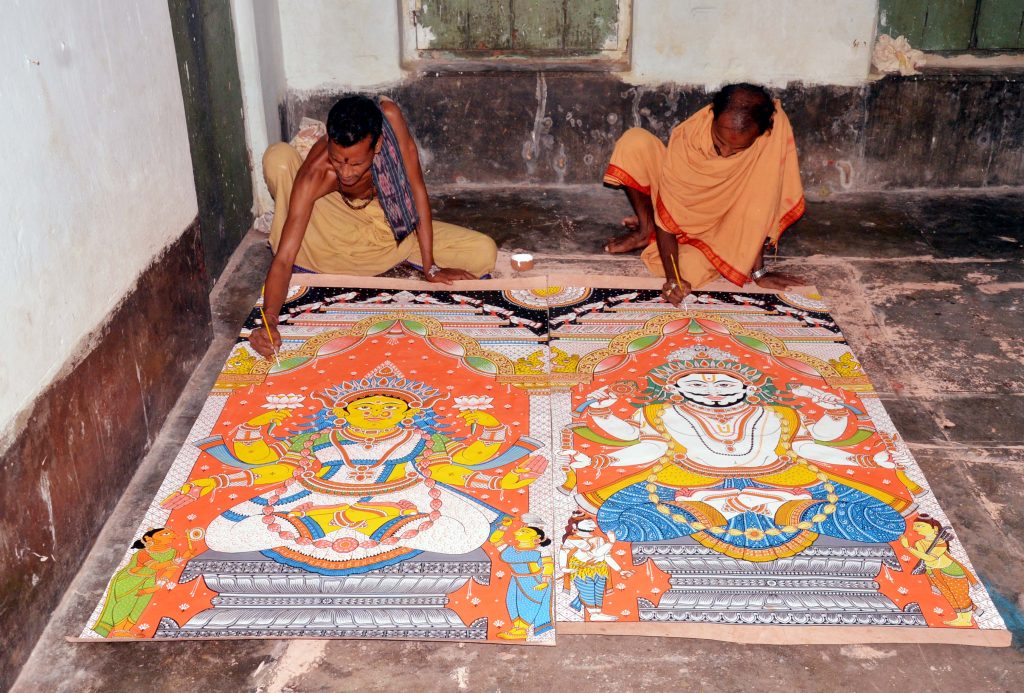 Artists painting the Pattachitra forms of the three deities that is worshipped during the ‘Anasara’ period, Image via Orissapost.com
