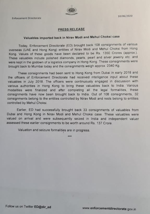As per the press release, the Enforcement Directorate has brought back 108 consignments of various overseas entities belonging to Nirav Modi and Mehul Choksi. The value of the consignment recovered worth 1350 crore rupees. The valuables include polished diamonds, pearls, and silver jewellery. The valuables were kept in godowns of a logistics company in Hong kong. The Consignments were brought back to Mumbai, the valuables weighed 2340 kgs.