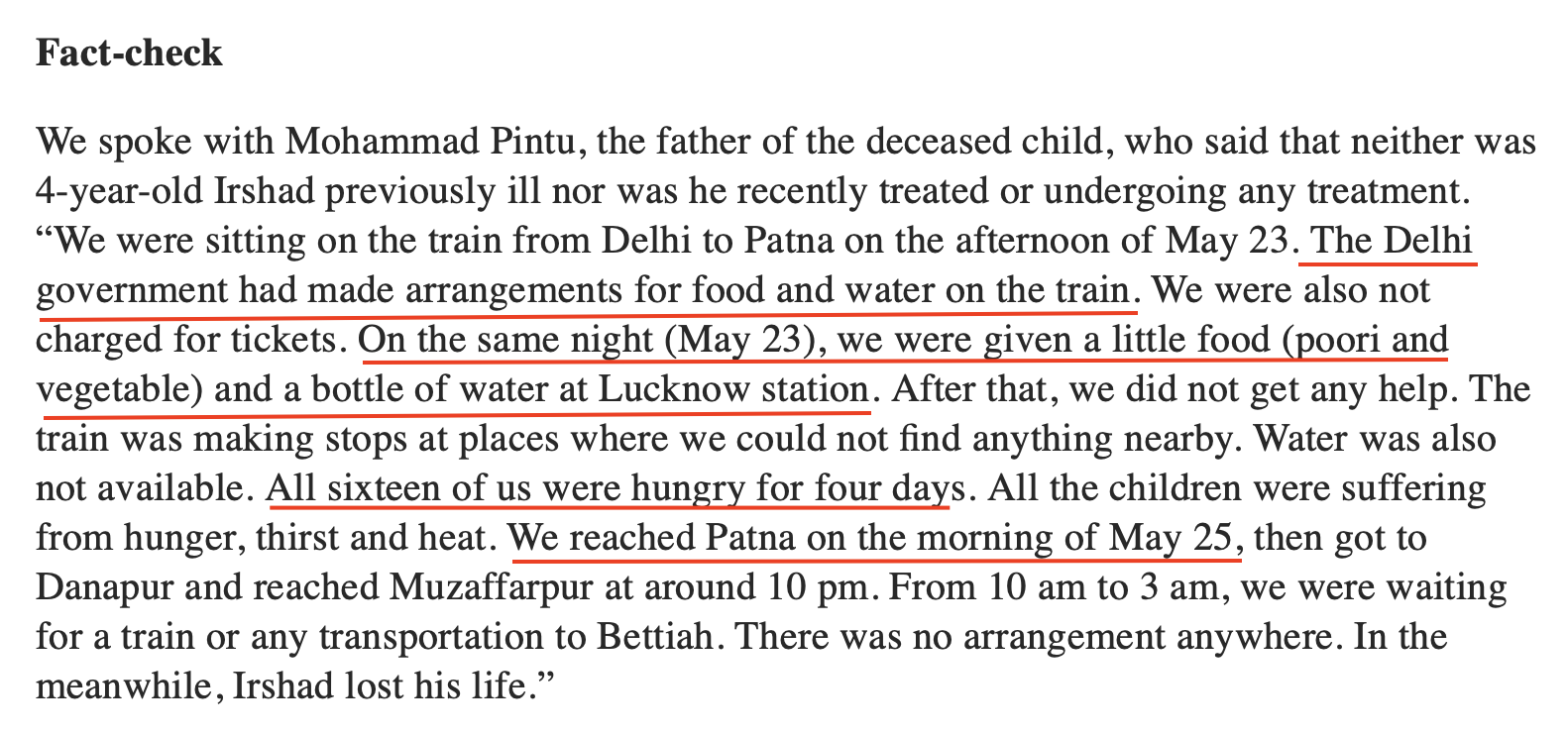 However, the fourth statement about Arvina’s hunger came from Wazir who said he saw her eating before they boarded the train. The fifth instance of statements on her hunger comes from Noor Parvez, a Dainik Bhaskar local reporter, who talked to the family (some of them not even on that train) which claimed that ‘none of the passengers’ were given any food or water.