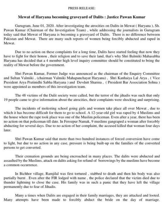 In a press release on June 1, former Justice Pawan Kumar, who headed the investigation team to probe the atrocities inflicted against Hindus, especially Dalits, in Haryana’s Mewat had said that there is no difference between Pakistan and Mewat.