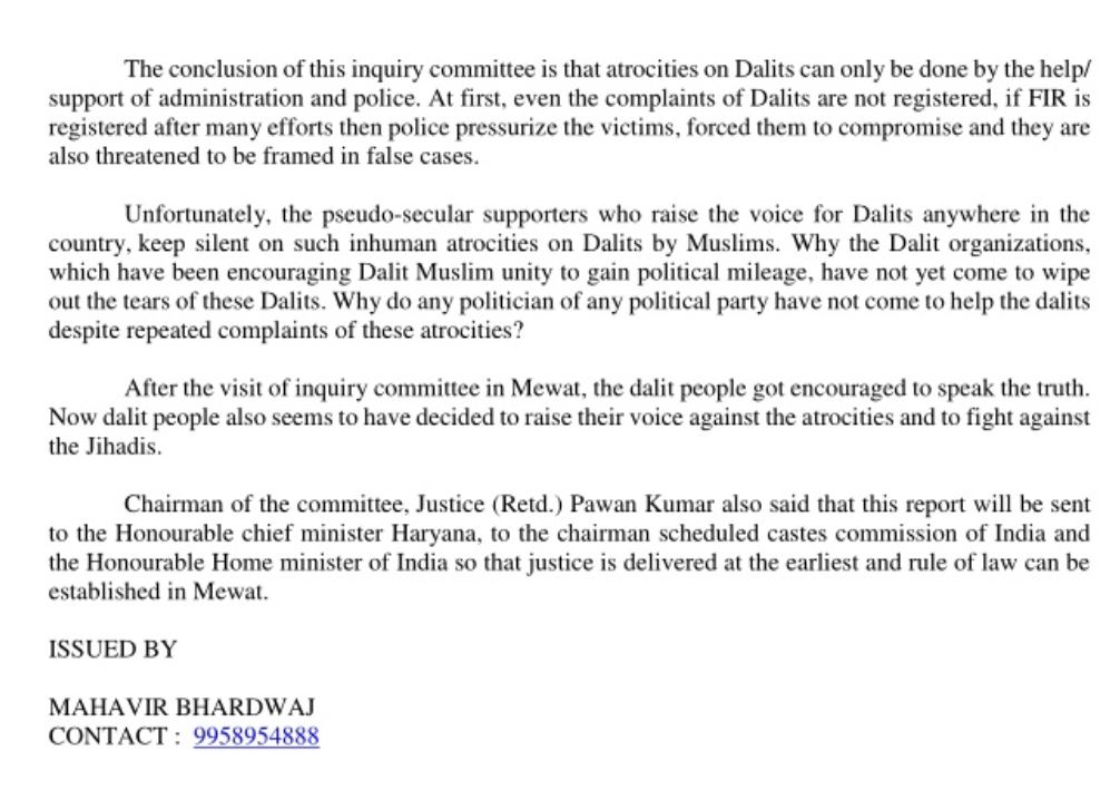 Justice Pawan Kumar claimed that he had called 48 victims of the Dalit society for questioning, but the horror and fear of Islamists among the victims is so palpable that only 19 out of the 48 victims of the Dalit society turned up to register their complaints against the brutalities meted out on them.