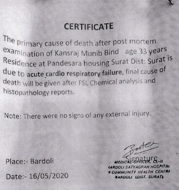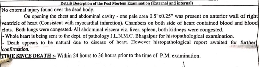 Similarly, the post mortem report of Lal Babu Kamat said that he passed due to heart disease, pending further confirmation from the histopathological report. The post mortem was conducted at the JLN Medical College in Bhagalpur, Bihar. He passed away on the 26th of May.