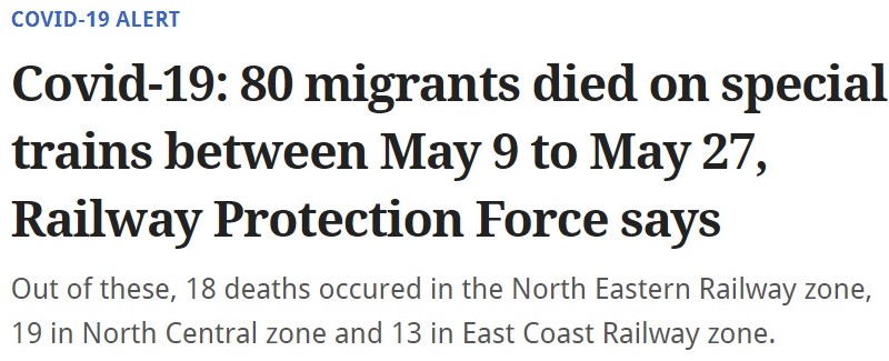 Scroll published a report based on the report by Hindustanh Times but gave their own twist to the tale. They claimed, “Nearly 80 migrant workers died of starvation or heat sickness between May 9 and May 27 while travelling on special trains to their home villages amid the lockdown to contain the coronavirus, according to the data from the Railway Protection Force reviewed by Hindustan Times.”