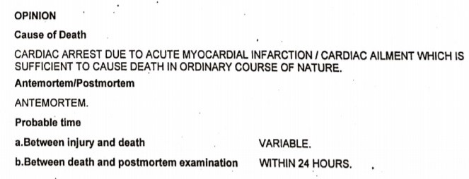 The post mortem report Babu Ram Chandel, a resident of Himachal Pradesh, showed that he had died due to Cardiact Arrest due to acute myocardial infarction, which is an ailment that is sufficient to cause death in ordinary course of nature. The post mortem was conducted at BK Hospital in Faridabad, Haryana.