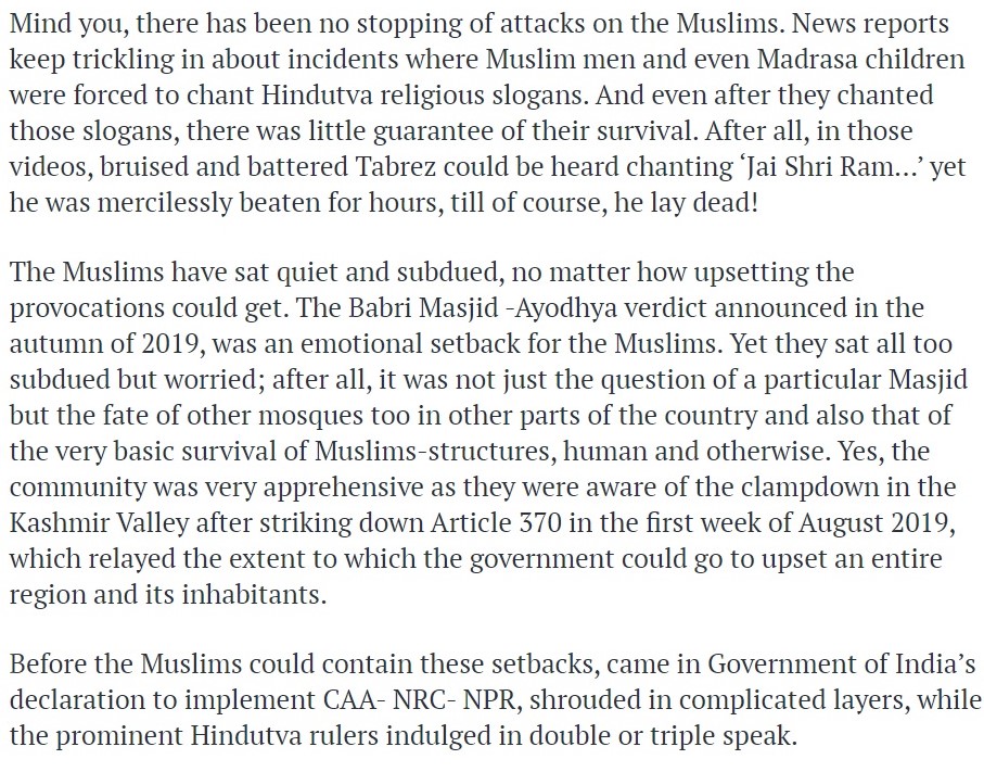 The author then proceeded to say, “Even before Spring of 2020 could arrive, came in news of the targeted killings of Muslims, in North East Delhi. Yet the hate speech givers and the goon brigades backed by the political mafia were not detained nor arrested despite the fact that there was sufficient evidence to show the role played by particular Right- Wing men who’d come up with communally charged abusive speeches and much more along the strain.”