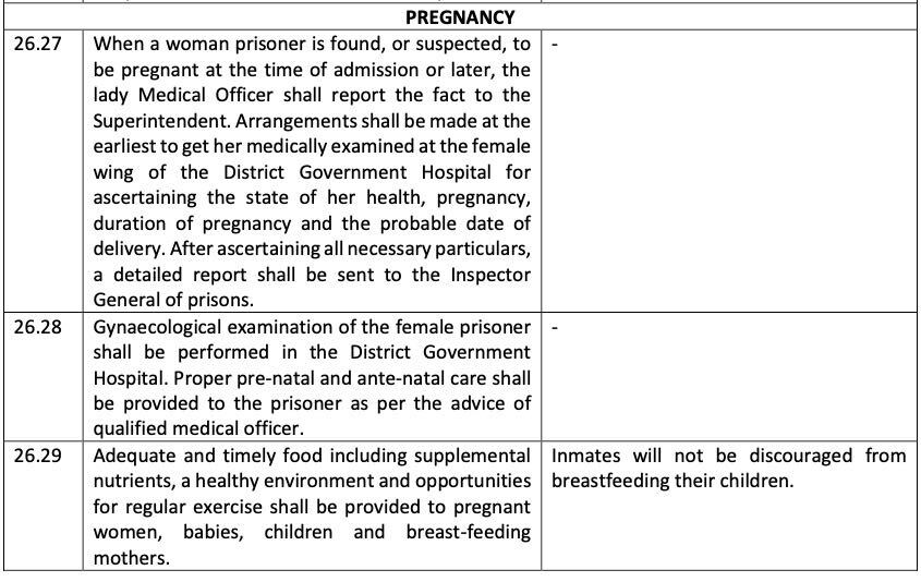 The manual said that even if a prisoner is suspected of being pregnant, arrangements shall be made at the earliest to get her medically examined. The detailed report of the examination is then sent to the Inspector General of Prisons.
